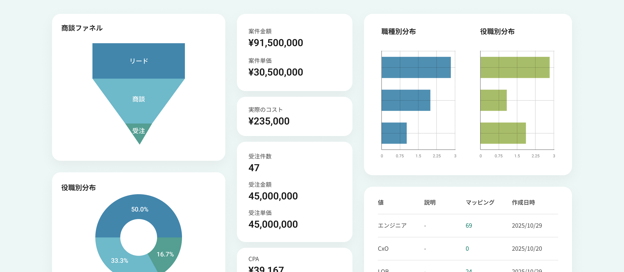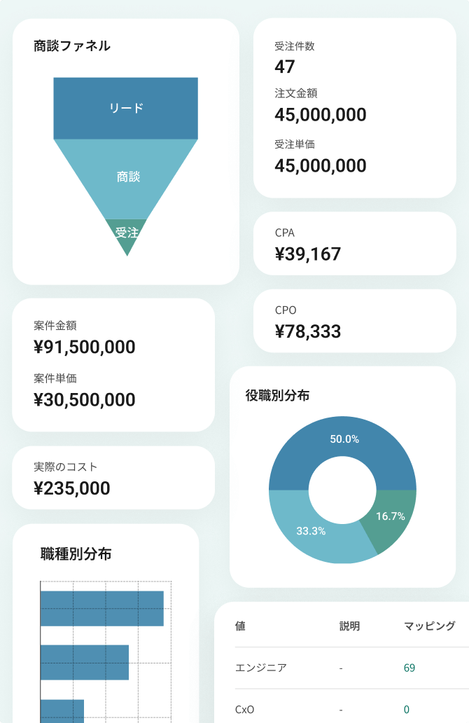 顧客獲得の入り口から受注に至るまでの各フェーズの転換率、単価、CPA、CACなどの主要KPIを可視化します。