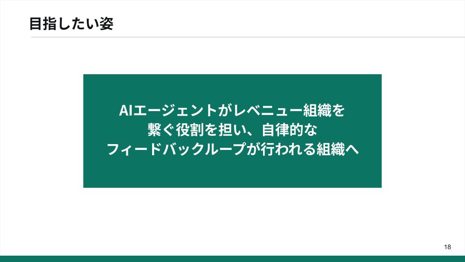 「レベニュー組織をつくっていくにあたって、今以上にマーケティング・IS・FS・CSそれぞれの、健全なフィードバックループをつくる必要があると思っています。しかし、人手だけでは難しいため、データ精度向上やフラットなフィードバック、人からでは得にくい示唆、傾向分析などをAI エージェントに手助けしてもらいつつ、組織強化・事業成長をしていく。そのような姿を目指していきたいです」(川島氏)