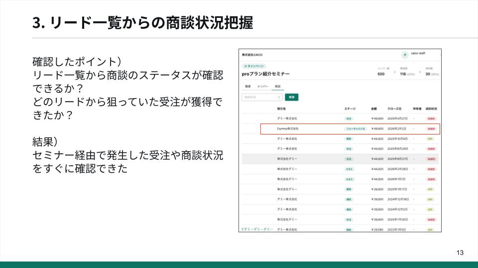 同ツールの具体的な活用方法や効果について、川島氏は話を続けます。同社では複数のテーマやターゲットセグメントに合わせてセミナーを実施。それぞれのセミナーにおいて、ねらい通りに受注獲得できているかを確認するため、セミナー参加人数、セミナーでのリード獲得→商談→受注それぞれのステータスや推移率などを、同ツールを用いて一覧化しました。