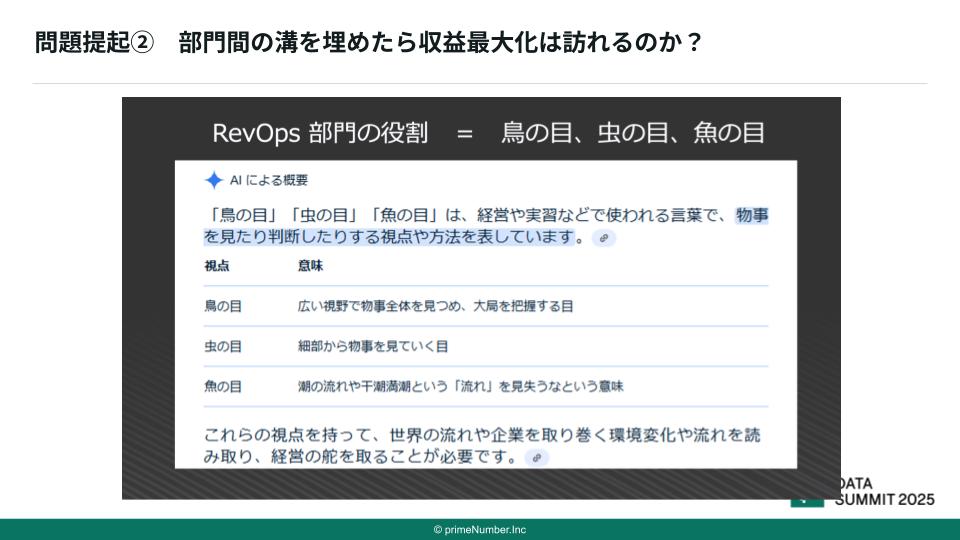 「ビジネスには鳥の目・虫の目・魚の目という言葉があります。鳥の目で俯瞰して、大局を把握する。異変や特異点があったときに、虫の目で細部を見る。ゴールへの乖離や異変が続く場合は、魚の目を持って一時的なのか、潮目が変わっているのかの流れを判断する。「このような変化を、数字を見てわかるようにすることが、RevOpsには不可欠です」と小島氏は語ります。