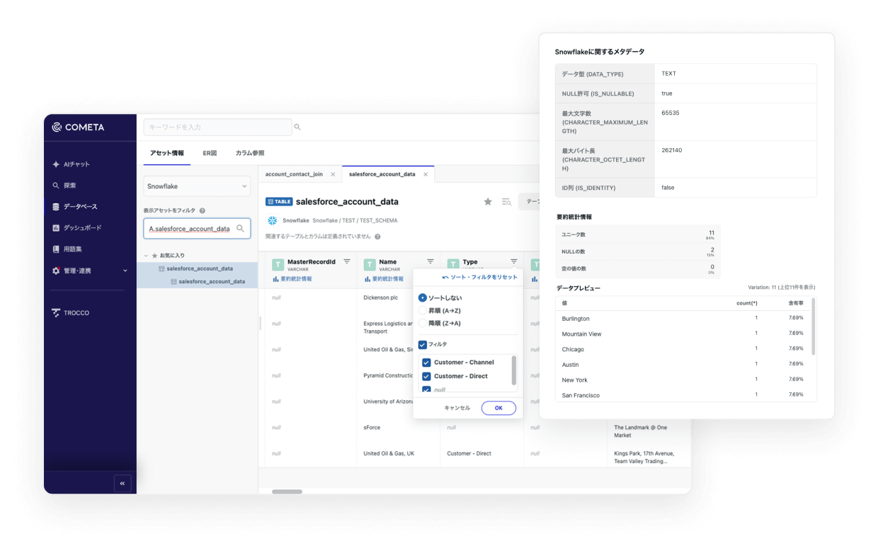 COMETAは、あらゆる利用者がデータを自由に探索し、価値を創造する世界を実現します。 独自のAIアクティブメタデータ技術がデータの「意味」を動的に管理・可視化し、 組織の誰もが本当に信頼できるデータへ辿り着ける環境を構築。 人とAI双方のデータ分析力を飛躍的に高め、かつてないスピードでビジネスの成長を導きます。