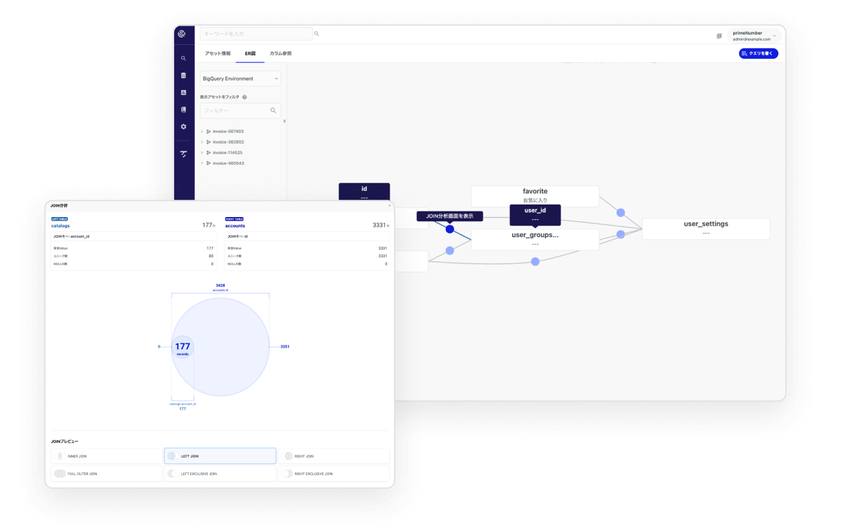 JOIN分析機能では2つのテーブルをJOINしたときの行数を、ベン図によって視覚的に確認することができ、データの重複や関係性を簡単に把握できます。