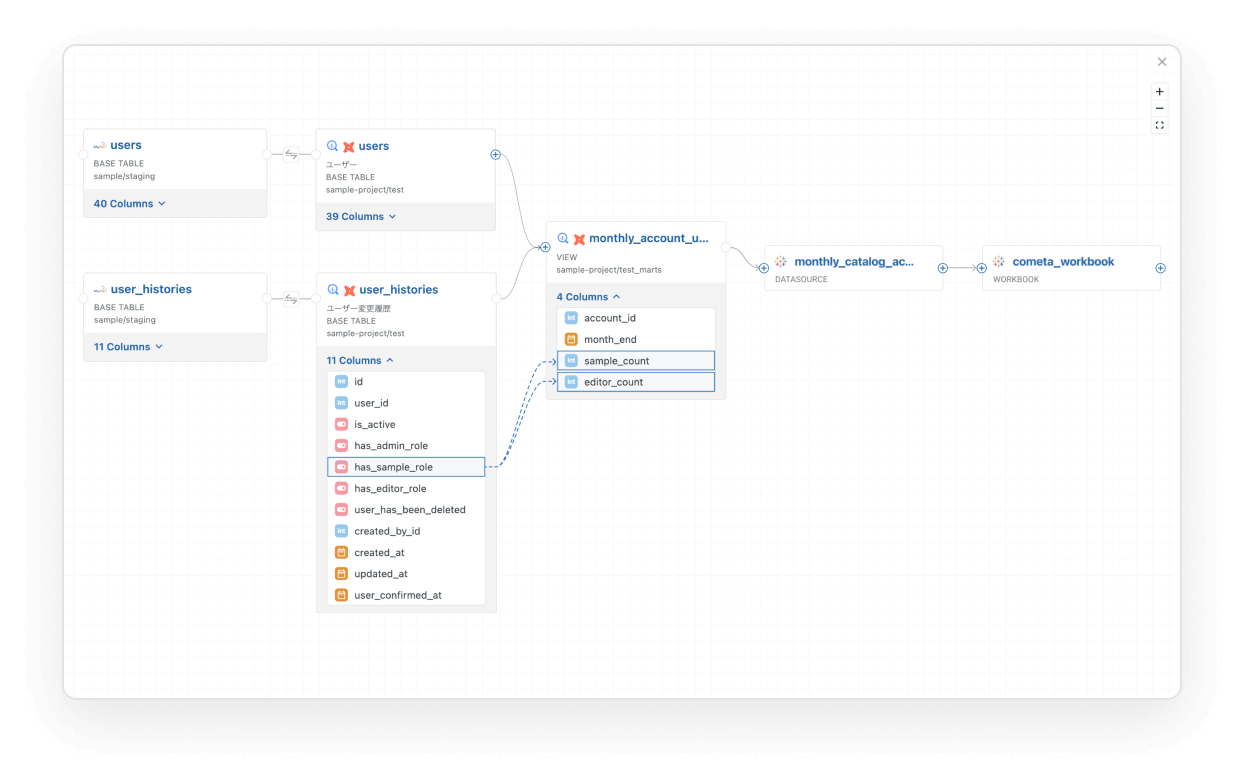 COMETAでは、テーブルの関連性を管理でき、ER図を生成することができます。TROCCOをご利用の場合は、各種設定情報からテーブルの関連情報を自動で取り込みます。