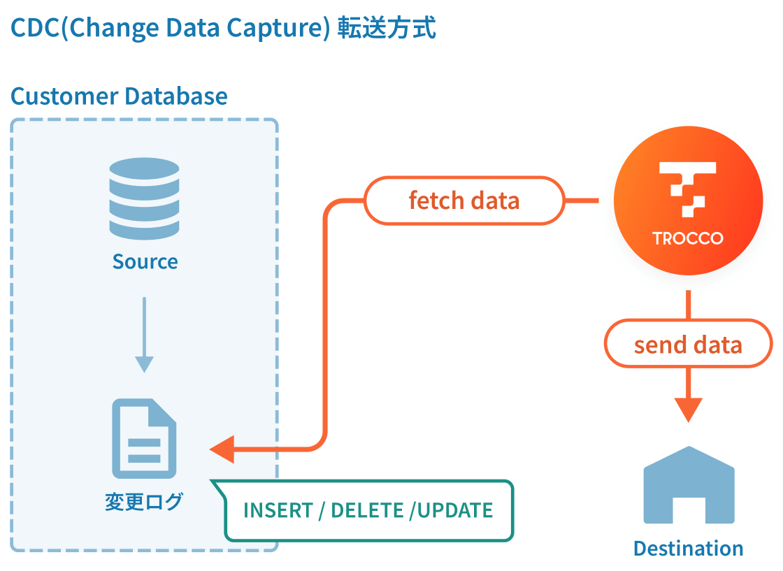 ソーステーブルの変更(追加・挿入・削除)ログを即座に確認し、転送先のテーブルへ同期